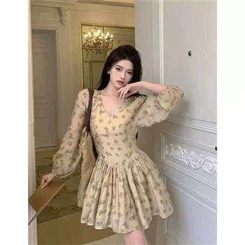 YF3560-图片色韩版早秋泡泡袖V领蝴蝶印花修腰褶折别致赫本风连衣裙