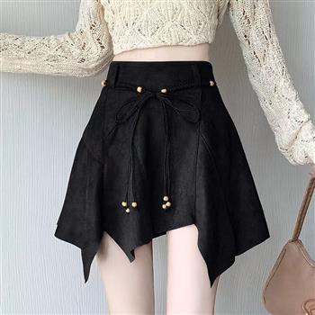 YF3561-(2色入内)秋冬新款钉珠绑绳高腰不规则载剪设计仿麂皮绒半身裙