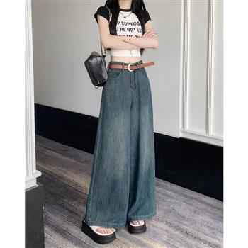 YF3570-图片色港味高腰系扣直筒阔脚裤 复古洗水怀旧气质牛仔裤