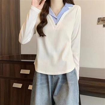 YF3571-(2色入内)假两件条纹拼接POLO领长袖弧边设计感休闲百搭港式T恤