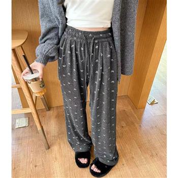 YF3553-(5色入内)休闲松紧腰绑绳直筒坠地感蝴蝶结印花山本裤 韩版阔腿裤