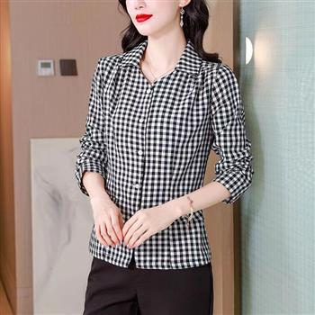 YF3555-图片色韩版长袖翻领V领系扣复古格子衫 时尚通勤休闲小衫