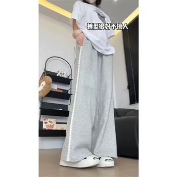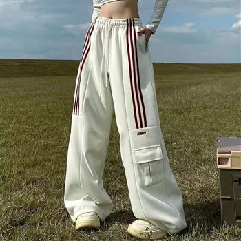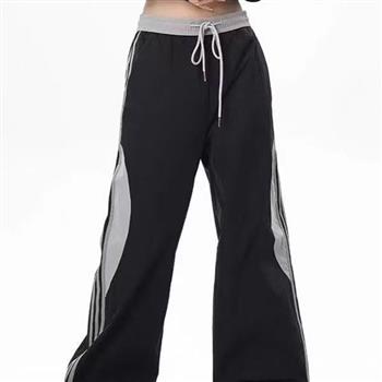 YF3578-(2色入内)美式撞色绑绳高腰三条杠条纹直筒坠地感休闲运动裤