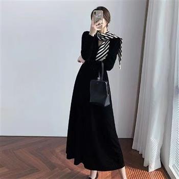 YF3574-(2色入内)韩版长袖V领束腰中长款金丝绒赫本风冬装优雅气质连衣裙