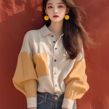 YF3575-图片色温柔风落肩袖翻领二色拼接胖MM大码显瘦别致春秋洋气衬衫