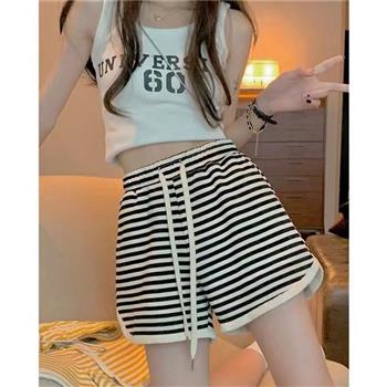 YF3559-(4色入内)港式松紧腰绑绳直筒坠地感慵懒风条纹显瘦休闲卫衣裤