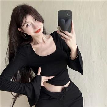 YF3582-(6色入内)早秋新款开叉微喇叭设计长袖圆领弹力显瘦欲女风T恤
