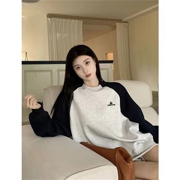 YF3579-图片色韩版长袖连肩二色拼接宽松大码字母印花圆领BF卫衣潮