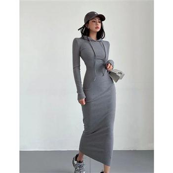YF3587-(4色入内)早秋长袖连帽弹力修腰包臀中长款显瘦休闲百搭连衣裙