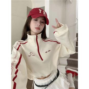 YF3588-图片色时尚长袖连肩翻领拉链字母刺绣宽松大码短款卫衣 辣妹潮衣