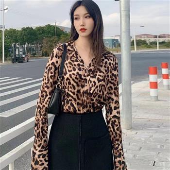 YF3329-图片色性感时尚辣妹豹纹长袖翻领宽松大码春秋百搭休闲秋装新款
