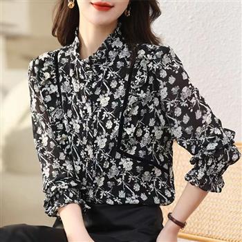 YF3331-图片色木耳小众设计碎花别致宽松大码雪纺衫 韩系春秋减龄花俏衬衫