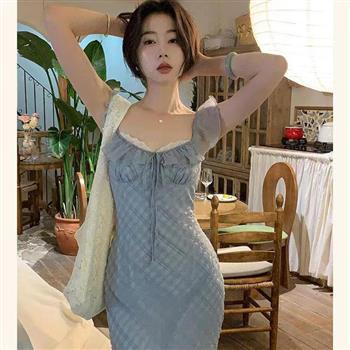 YF3337-(2色入内)甜美时尚荷叶边小飞袖修腰系绳设计感中长款礼服裙