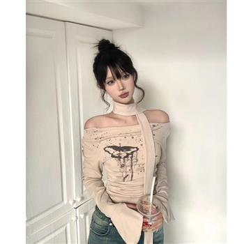 YF3336-图片色性感时尚一字肩涂鸦蝴蝶印花围巾挂脖弹力收腹上衣