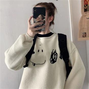 YF3339-图片色冬季新款可爱刺绣羊羔绒宽松大码束腰慵懒风长袖圆领外套