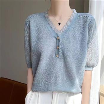 YF3344-(3色入内)名媛气质网纱短袖花边系扣缇花蕾丝衫 时尚气质上衣