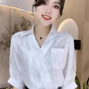 YF3347-图片色时尚亮丽丝中袖翻领交叉V领设计宽松大码别致上衣潮