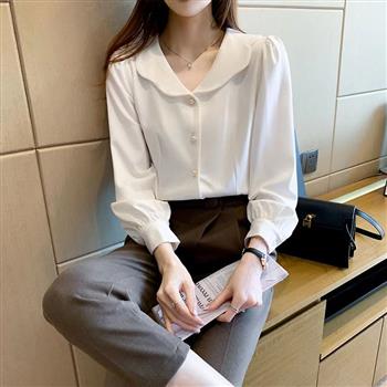 YF3349-图片色荷叶边翻领长袖别致设计珍珠扣宽松大码雪纺衫 白色简洁上衣
