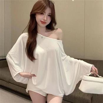 YF3350-(2色入内)时尚慵懒风露单肩宽松显瘦蝙蝠衫 新款春秋休闲T恤