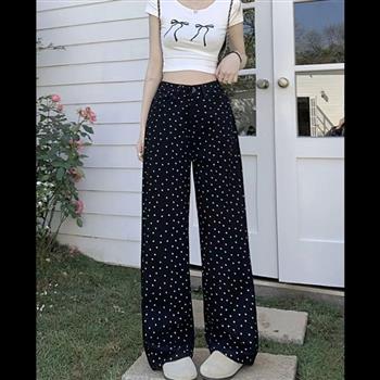 YF3353-图片色港式系扣高腰直筒波点设计复古休闲牛仔裤 春秋百搭长裤
