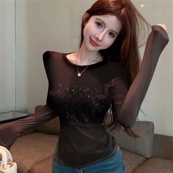 YF3354-(2色入内)网纱拼接亮片小众设计透视袖弹力修身开叉春秋新款上衣