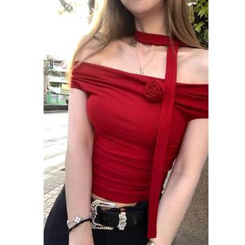 YF3355-(2色入内)性感时尚一字肩围脖玫瑰花抹胸设计弹力修身显瘦T恤潮