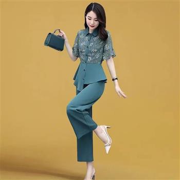 YF3358-(3色入内)优雅时尚OL通勤套装 微喇叭短袖系扣上衣搭松紧腰西装裤两件套
