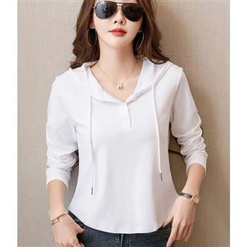 YF3359-(3色入内)春秋长袖连帽抽绳系扣弧边小众设计感新款上衣潮T恤