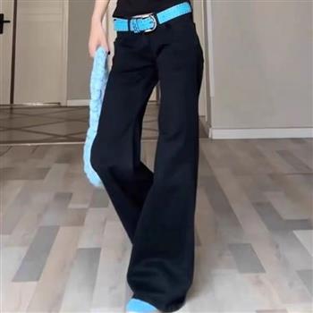 YF3367-图片色纯黑色赫本风系扣低腰显瘦微喇叭设计坠地感休闲牛仔裤