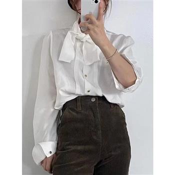 YF3368-(2色入内)春秋小众系蝴蝶结长袖立领系扣宽松大码chic气质衬衫