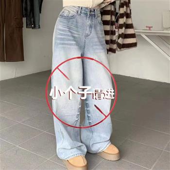 YF3369-图片色2024新款系扣高腰直筒做旧破洞抓痕拖地休闲牛仔裤