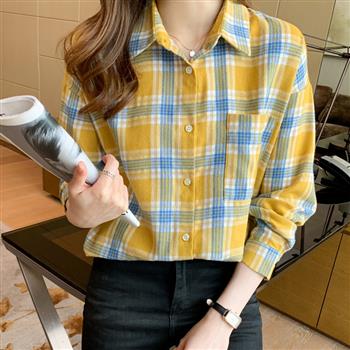 YF3364-图片色韩版落肩袖翻领ins大码上衣 复古格子宽松春秋百搭衬衫
