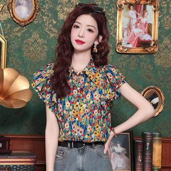 YF3363-图片色港风小飞袖系扣褶折碎花宽松大码复古雪纺衫 小众别致上衣