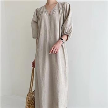 YF3365-(2色入内)棉麻舒适透气泡泡袖V领宽松藏肉显瘦高级感连衣裙